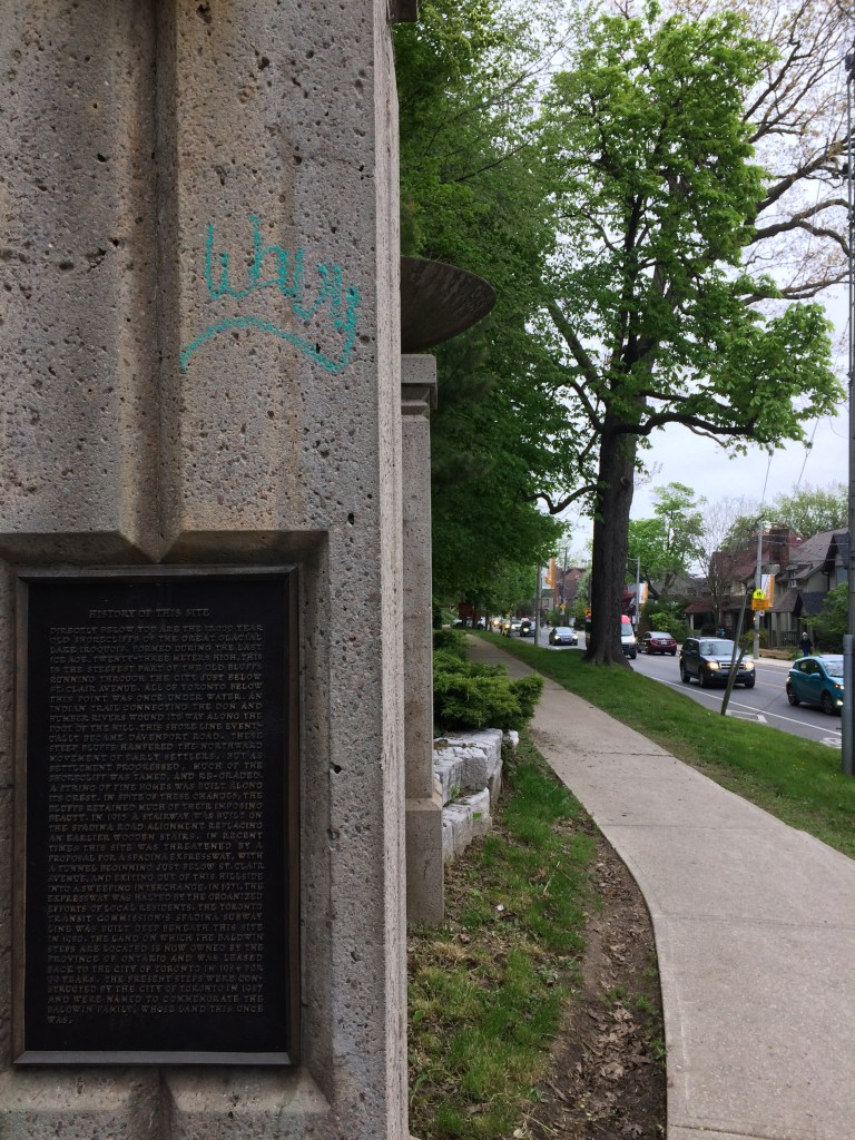 A fascinating discovery at the foot of the steps that lead up to Casa Loma in Toronto. Davenport Road became what it is due to an indigenous trail already existing at the foot of the bluffs. Further back in time, the land from this point out to what is now Lake Ontario was all under water. Perhaps with climate change it will eventually revert.