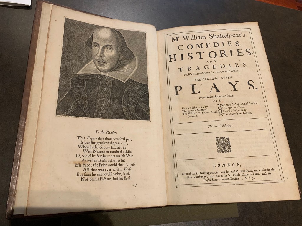 Imagine my excitement to learn that the Thomas Fisher Rare Book Library here in young Toronto was celebrating the 400th anniversary of Shakespeare’s Folios, the first published in 1623!